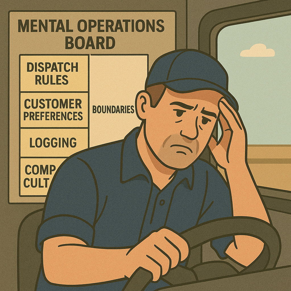 The pressure in truck driving usually comes from not knowing what to expect instead of workload. Drivers new in the company or drivers who switch companies are adjusting to change and often have no idea about dispatch procedures, new kinds of freight, and what is expected of them. This ignorance initiates brain activity: “Am I right?” “Am I behind?” “Is that current?” The mind you need to do the work, when you don’t have the right structure, it stays in problem resolution, and this leads to exhaustion.