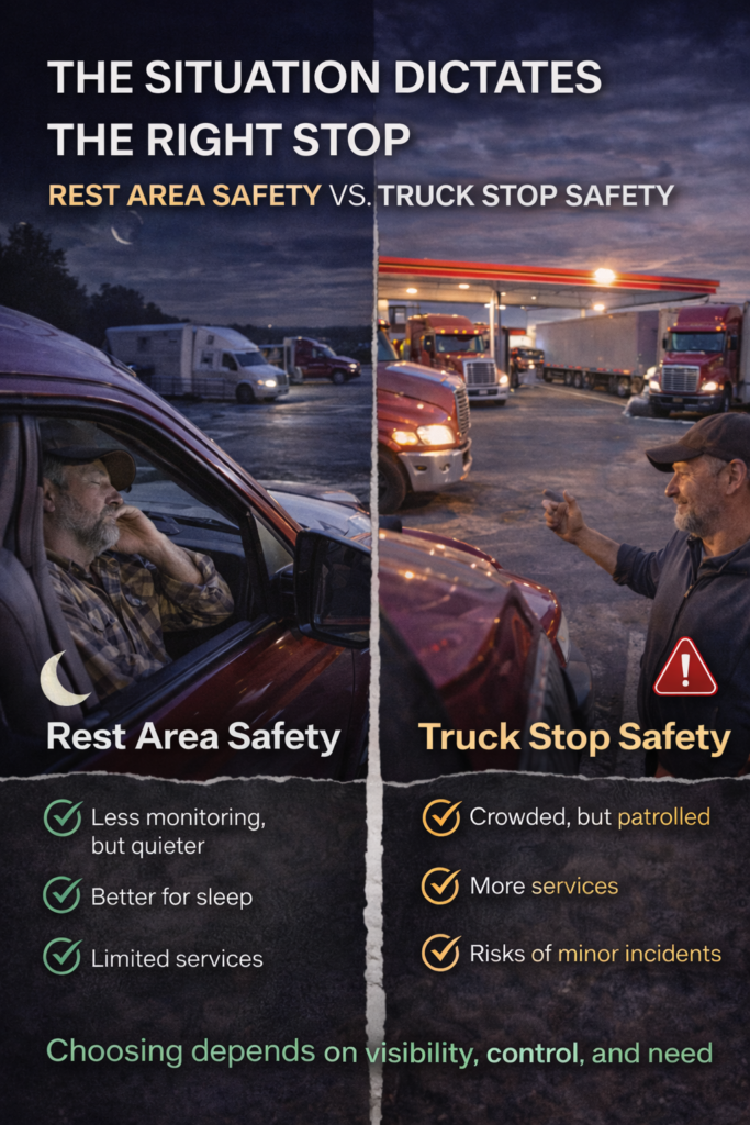 Truck stops offer amenities and visibility, but because of crowded situations, they can increase the risks of minor accidents, confrontations, or sleeping disruption. The ability to perceive these dissimilarities makes it possible for drivers to make a choice that is based on the situation instead of a habit.