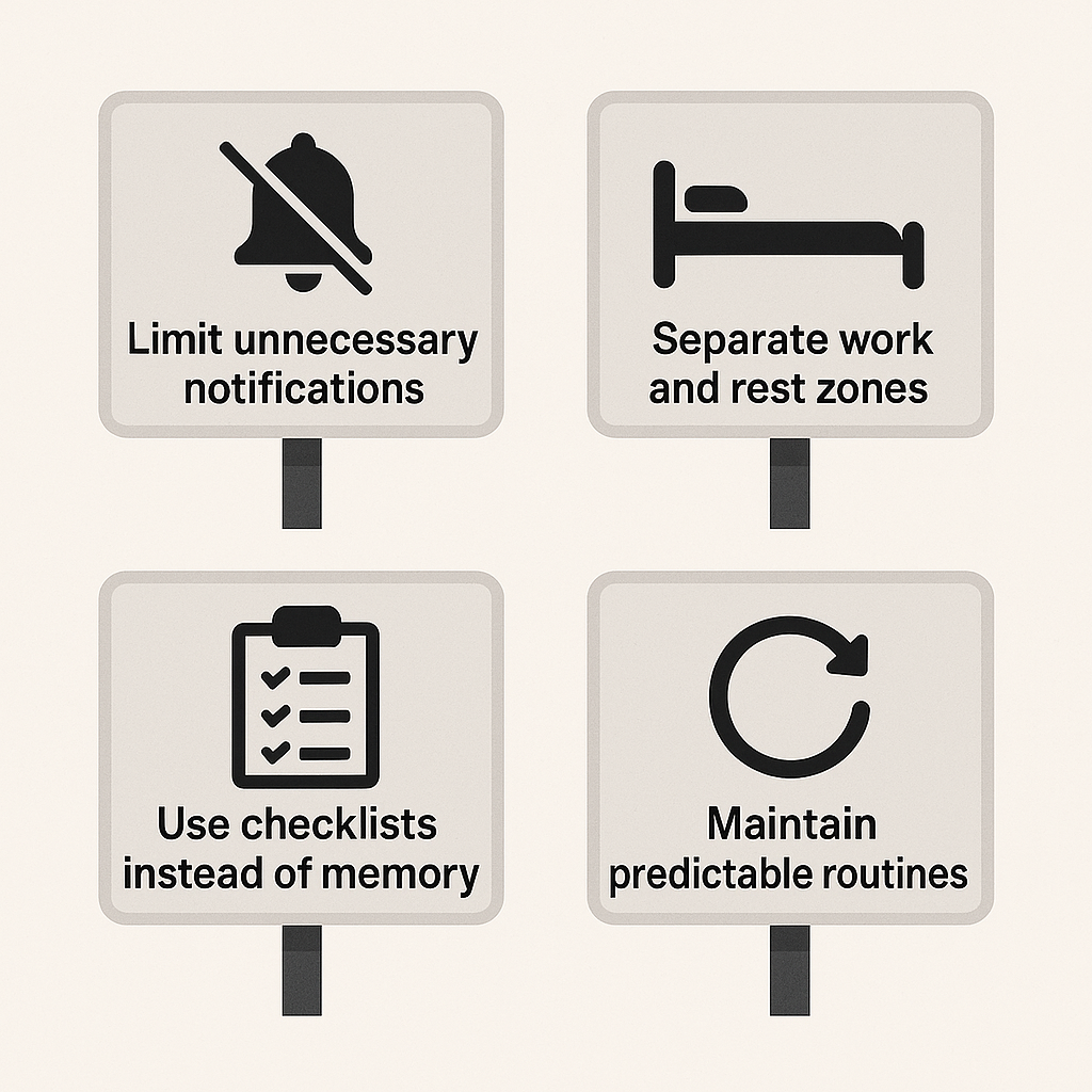 | Predictable routines | Lower fatigue | Burnout risk |