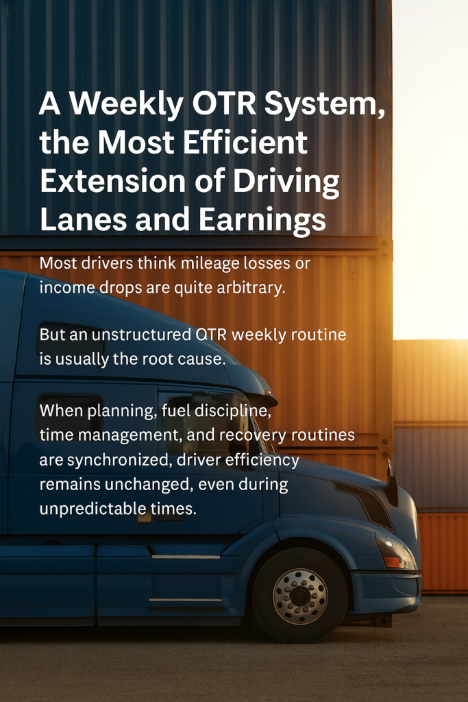 Daily performance does not reflect how resets, congestion, fuel strategy, and fatigue affect income. Weekly measurement reveals whether the OTR weekly routine supports consistent miles and controlled costs.