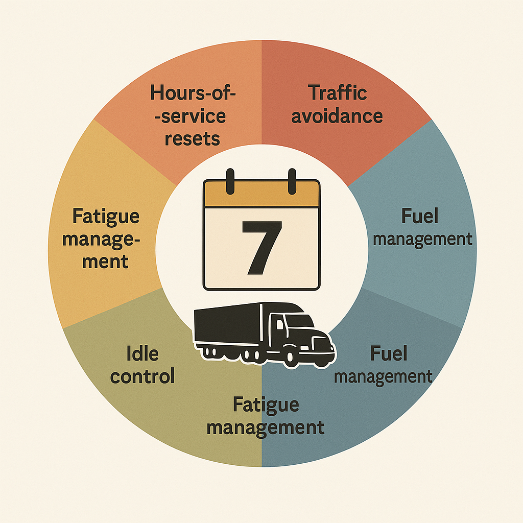 A week is a reflection of how hours-of-service resets are used, when traffic is absorbed or avoided, how fuel is managed, how idle time is controlled, how fatigue is lost or gained, and how miles become cash.